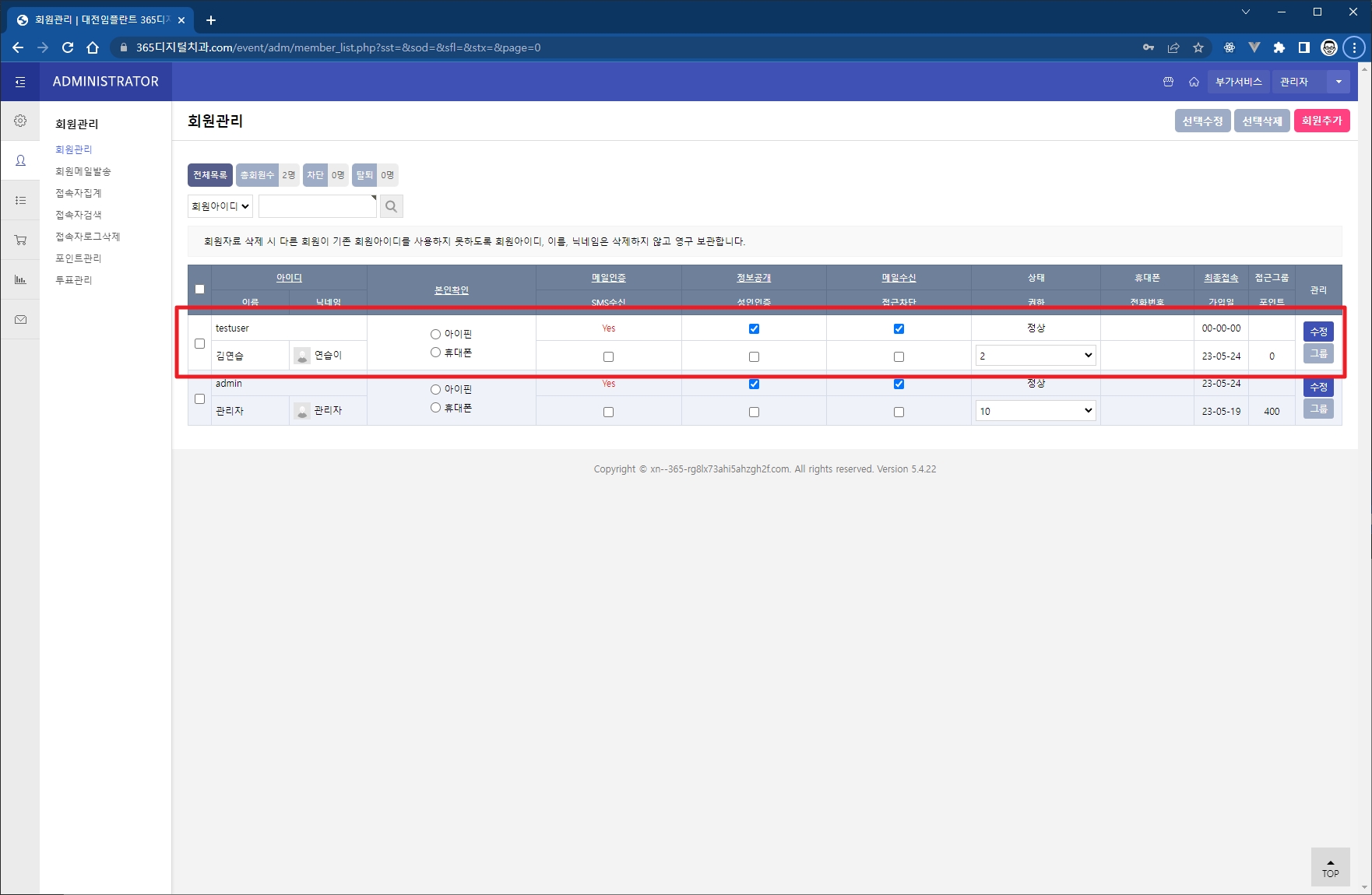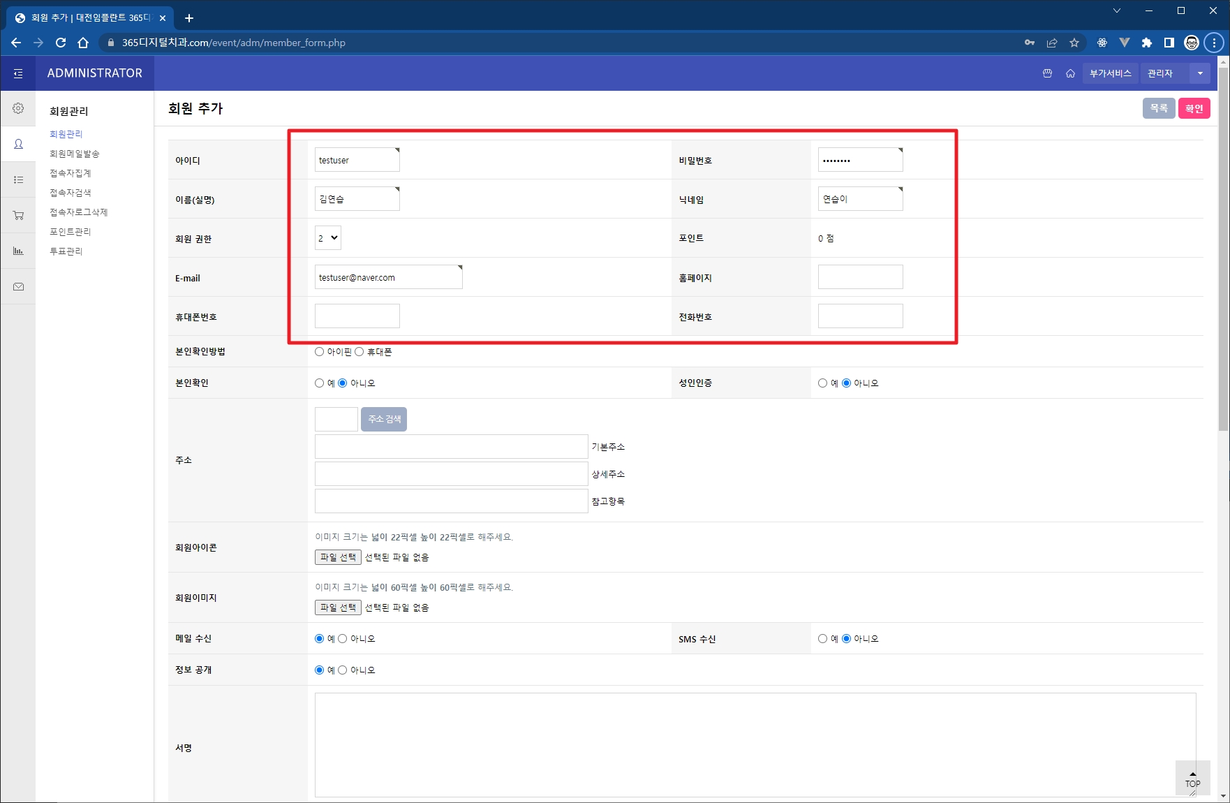 원하는 사이트의 관리자 페이지로 이동합니다. 회원관리의 회원추가메뉴를 클릭해서 최소한의 정보를 입력하고 확인을 클릭하면 회원이 추가됩니다 . 로그인이 적용되어 있는 홈페이지에서 로그인이 가능한 회원을 만들기 위함입니다.