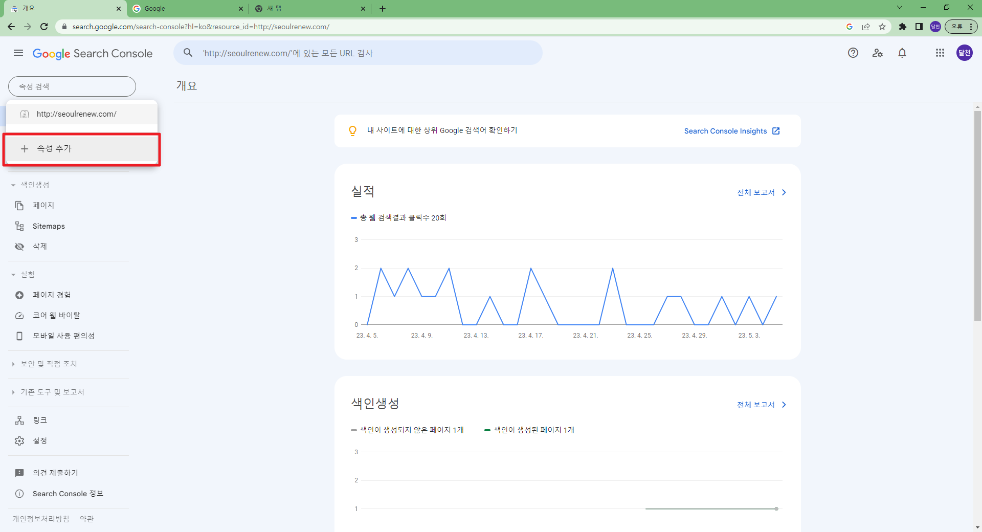구글에서 구글서치콘솔을 검색하면 해당사이트로 이동 가능 구글서치콘솔 (구글 웹마스터도구) https://search.google.com/search-console?hl=ko 홈페이지에 구글 웹마스터도구를 등록하기 위해서는 반드시 구글 계정이 반드시 필요합니다. 보통 클라이언트의 구글 계정을 사용합니다. 코드를 복사하고 해당 사이트의 관리자로 이동합니다. 그림과 같이 관리자화면에서 해당 코드를 복사해서 붙인 후 완료를 클릭해서 코드값을 저장합니다. 저장을 한 후 확인 버튼을 클릭해서 정상적으로 입력되었는지 구글에서 검증을 합니다. 사이트에 코드값을 넣지 않고 확인 버튼을 클릭하면 에러가 발생하니 순서를 주의해주세요