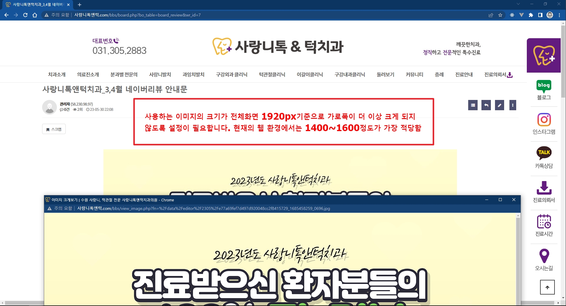 너무나도 큰 이미지는 안됩니다. 적정 사이즈로 줄여주세요 기존 이미지 사이즈 원본 크기로 올리면 서버의 용량이 빨리 소진되므로 적당한 이미지 크기를 줄여서 업로드합니다. Tags:팝업