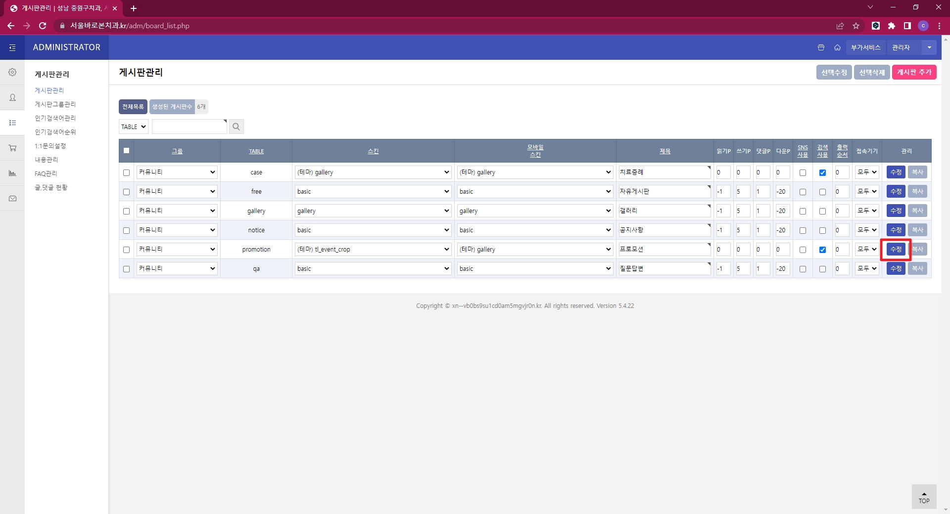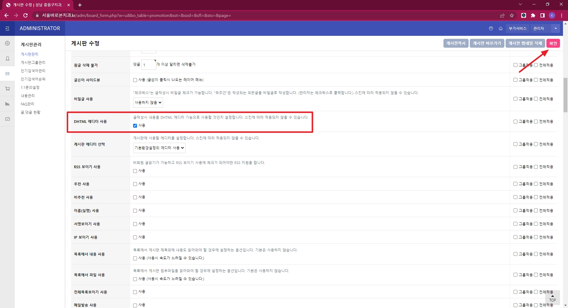 게시판에 글쓰기를 할 때 에디터가 보이지 않을 때는 아래 곳을 체크해보세요 그누보드로 제작된 사이트는 게시판마다 스마트에디터 활성화 체크가 있습니다. 관리자로 로그인 한 상태에서 게시판의 환경설정메뉴를 클릭하거나 관리자메뉴의 게시판 리스트에서 수정 버튼을 클릭해서 환경설정 메뉴로 진입할 수 있습니다.